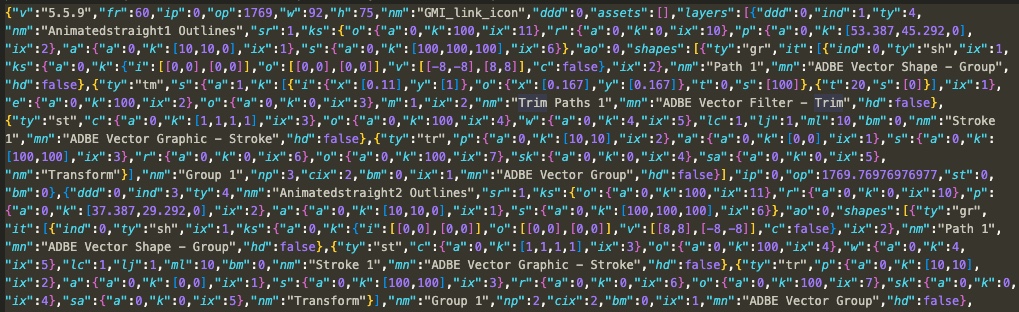 Lottie animations in their various stages, and example of the JSON generated by Bodymovin.